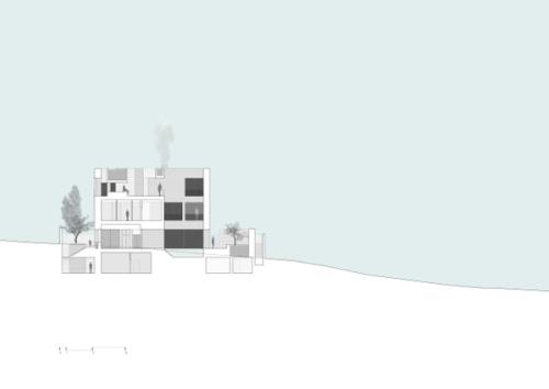 The project is to house a middle-aged couple and will become the weekend house for their grandchildren. The couple wished for a multi-level residence with a variety of levels inside, and with an openness to the landscape while maintaining the utmost privacy. Hence, the existing terrain was utilized; the ground floor along with the landscape trace the natural contours, maintaining the existing earth line inside-out. Such utilization was well adapted to the functional brief, where there was a spatial desire for a vertical room the functions were placed on the lowest contours, while the ceiling level remains fixed all around the floor.